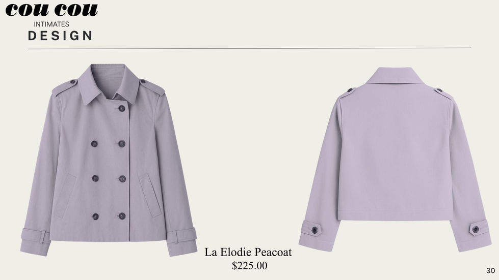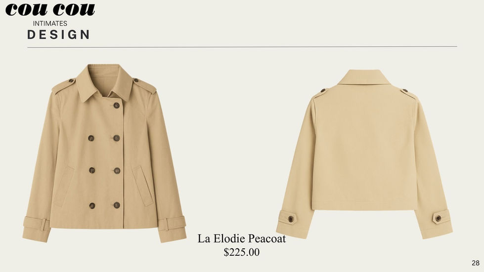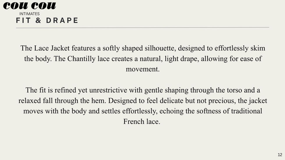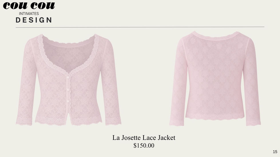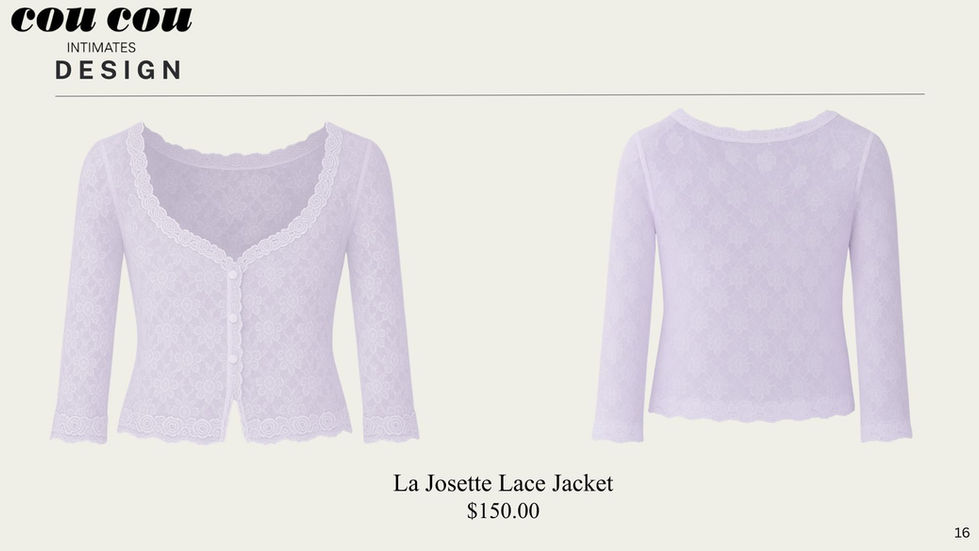 Cou Cou Intimates has redefined chic lingerie with classic French designs and details. This Case Study plays with Cou Cou's current brand strategy by introducing refined jackets to wear with their current collections.